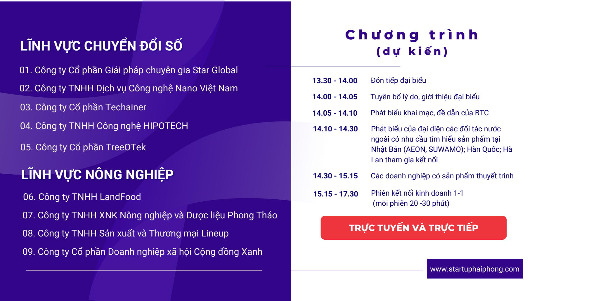 Ban tổ chức đã lựa chọn 09 doanh nghiệp đổi mới sáng tạo với các sản phẩm/ giải pháp thuộc lĩnh vực chuyển đổi số và nông nghiệp tham gia kết nối. Đồng thời sự kiện có sự tham gia của các doanh nghiệp, tổ chức nước ngoài (Hà Lan, Nhật Bản, Hàn Quốc) để kết nối, tìm hiểu các sản phẩm/ giải pháp của doanh nghiệp Việt Nam.