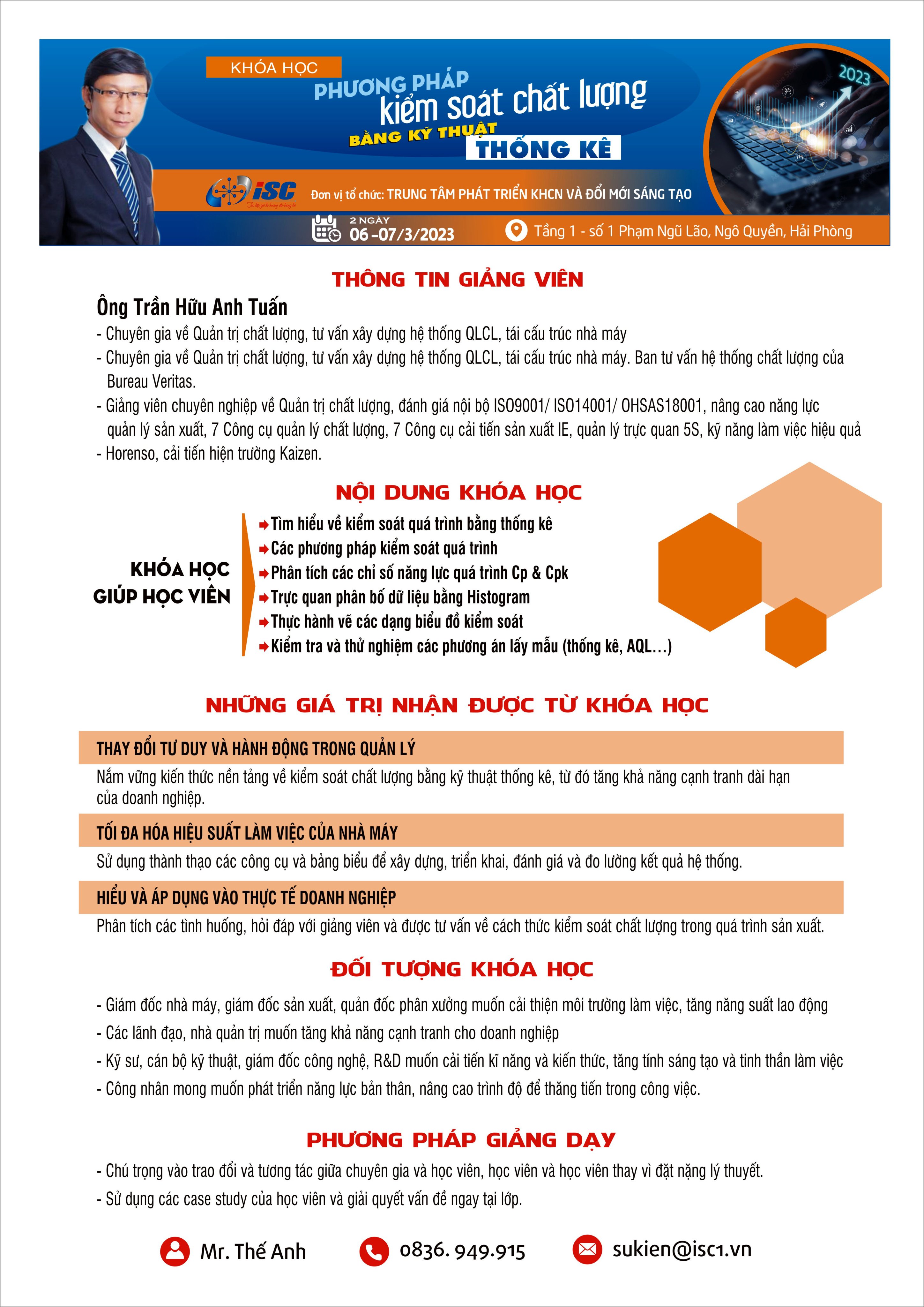 Nhằm hỗ trợ các tổ chức, doanh nghiệp trong thành phố nâng cao năng suất chất lượng sản phẩm hàng hóa, dịch vụ và giảm thiểu tối đa lãng phí hoạt động sản xuất kinh doanh của đơn vị, Trung tâm Phát triển khoa học – công nghệ và Đổi mới sáng tạo - Sở Khoa học và Công nghệ thành phố Hải Phòng tổ chức khóa đào tạo “Phương pháp kiểm soát chất lượng bằng kỹ thuật thống kê”