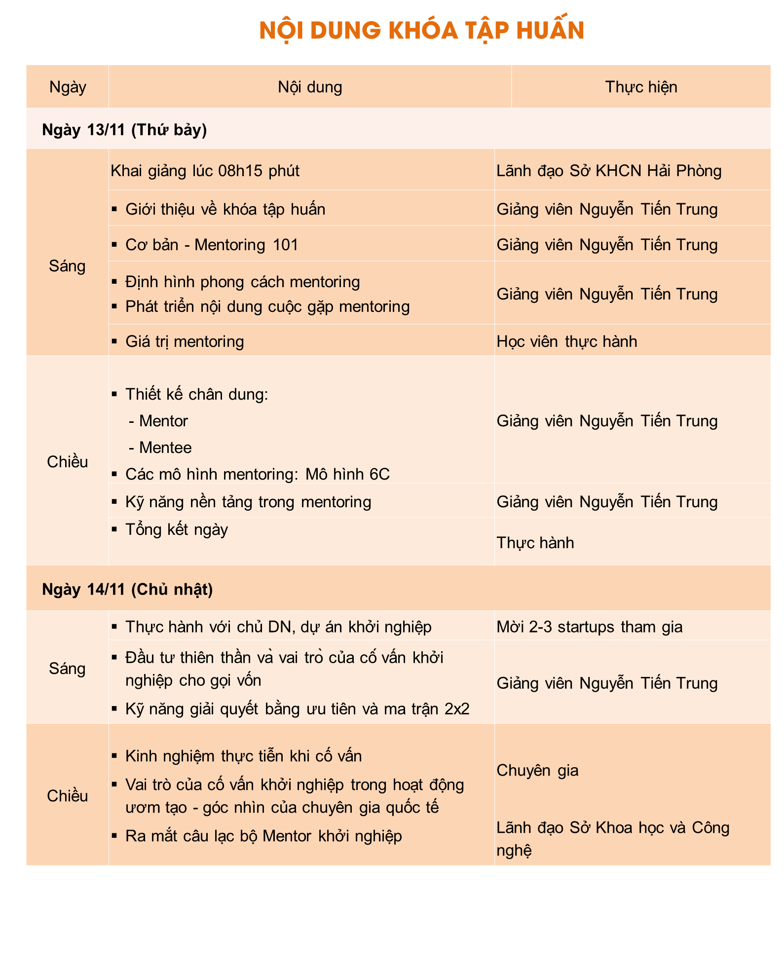 Thực hiện Kế hoạch số 281/QĐ-UBND ngày 10/12/2020 của Ủy ban nhân dân thành phố Hải Phòng về việc phê duyệt Kế hoạch phát triển hệ sinh thái khởi nghiệp đổi mới sáng tạo thành phố Hải Phòng giai đoạn 2021 – 2025, Sở Khoa học và Công nghệ Hải Phòng tổ chức “Khóa tập huấn kỹ năng cố vấn khởi nghiệp nâng cao” nhằm cập nhật các kiến thức kỹ năng cố vấn và xây dựng Câu lạc bộ Cố vấn Khởi nghiệp để hỗ trợ dự án Khởi nghiệp của thành phố.