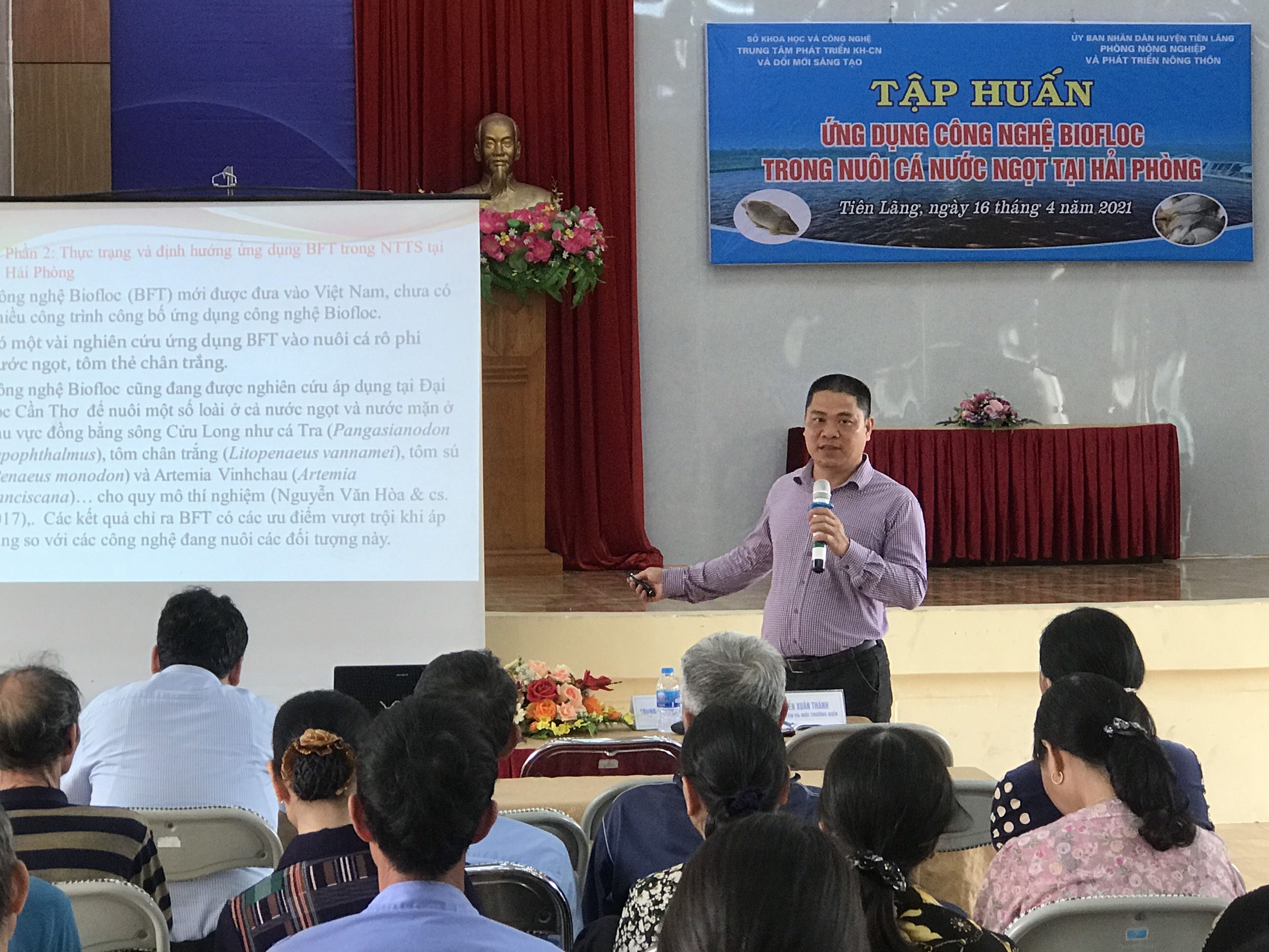 Triển khai Kế hoạch tổ chức tập huấn phổ biến các công nghệ, tiến bộ kỹ thuật, sản phẩm mới trong các lĩnh vực công nghệ sinh học, công nghệ tự động hóa, công nghệ vật liệu mới; công nghệ môi trường và năng lượng mới năm 2021, Trung tâm Phát triển Khoa học - công nghệ và Đổi mới sáng tạo – Sở Khoa học và Công nghệ Hải Phòng phối hợp với Trung tâm Khuyến Nông, UBND xã Minh Tân huyện Kiến Thụy tổ chức Hội nghị tập huấn “Ứng dụng công nghệ Biofloc trong nuôi cá nước ngọt tại Hải Phòng”